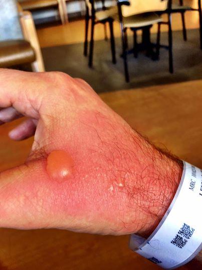 Ngoài việc da tay bị bỏng, ông còn bị chóng mặt, buồn nôn và phải điều trị ở bệnh viện bằng thuốc steroid và thuốc kháng histamine.