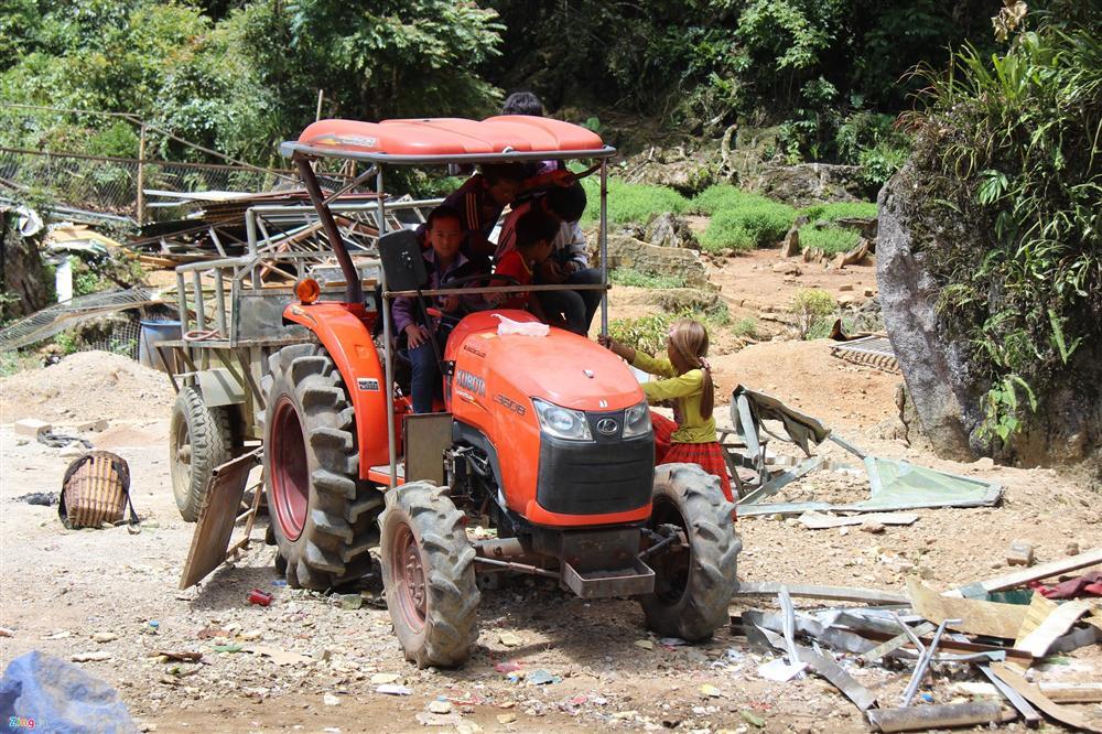 Những đứa trẻ ở bản Tà Dê trèo lên một chiếc máy kéo trước cửa sào huyệt của trùm ma túy. Do địa hình cách trở, rất ít phương tiện đi vào nên chúng tỏ ra thích thú khi nhìn thấy chiếc máy kéo này.