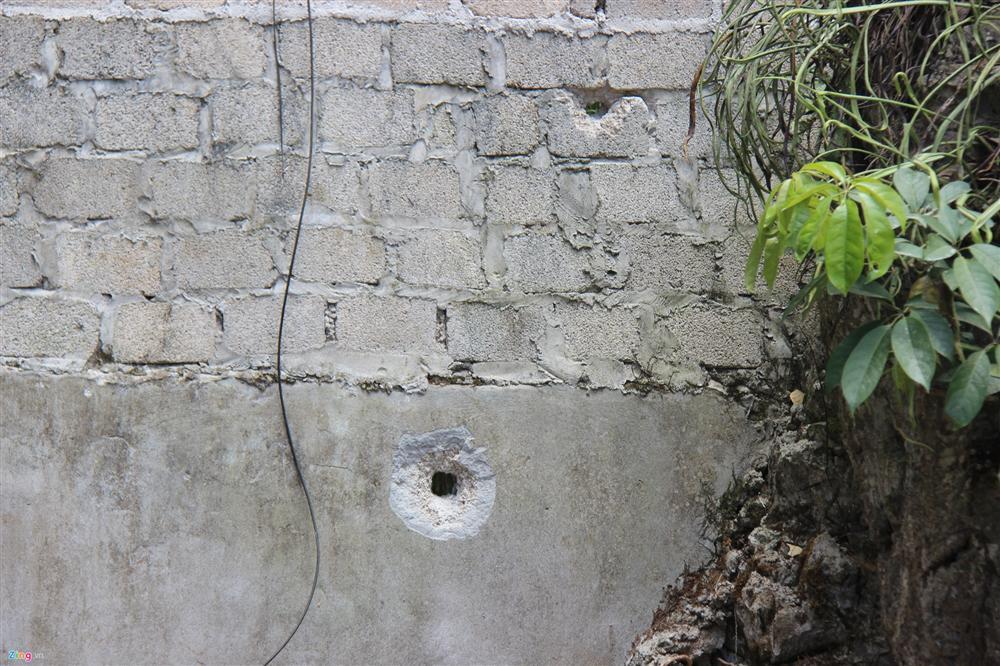 Bức tường phía cổng vào nhà Nguyễn Thanh Tuân còn in hằn những vết đạn lớn.