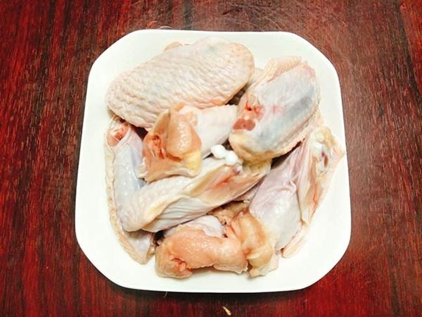 - Cánh gà sau khi mua về bạn đem rửa sạch sẽ với 1 thìa giấm, 1 thìa muối và bóp kỹ sau đó rửa lại vài lần với nước cho thật sạch. Tiếp theo chặt cánh gà làm 3 đoạn theo các khớp của cánh gà.