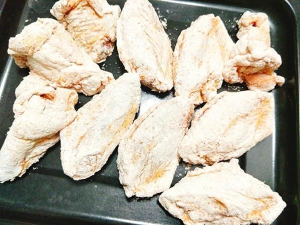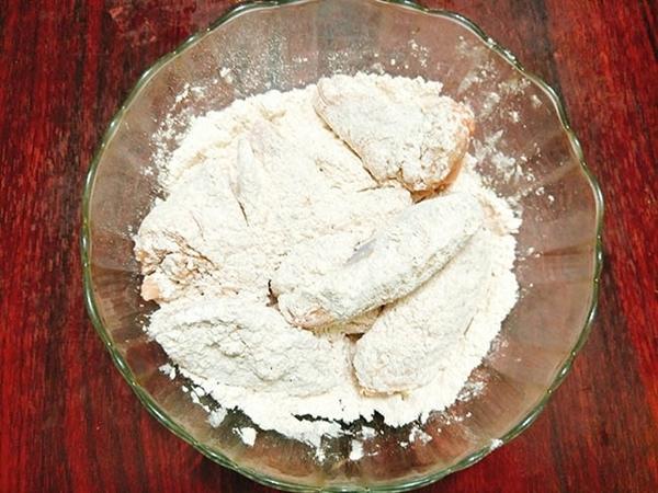 - Cho cánh gà vào tô bột vừa trộn sau đó xóc thật đều sao cho cánh gà bám đều 1 lớp mỏng bột bên ngoài là được.