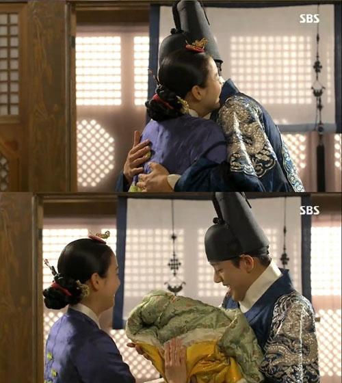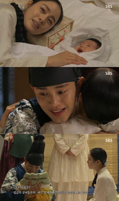Vua Lee Soon (Yoo Ah In) hạnh phúc ôm Jang Ok Jung (Kim Tae Hee) vào lòng sau khi cô nàng sinh cho anh một hoàng tử bụ bẫm.