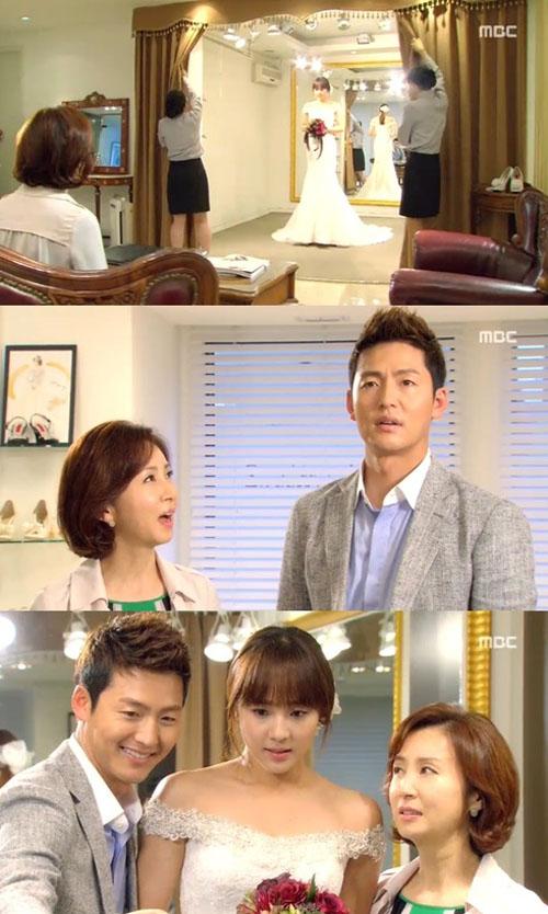 Yang Choon Hee (Jun In Hwa) lặng người ngắm nhìn vẻ đẹp rực rỡ của Min Chae Won (Yoo Jin) khi diện váy cưới.