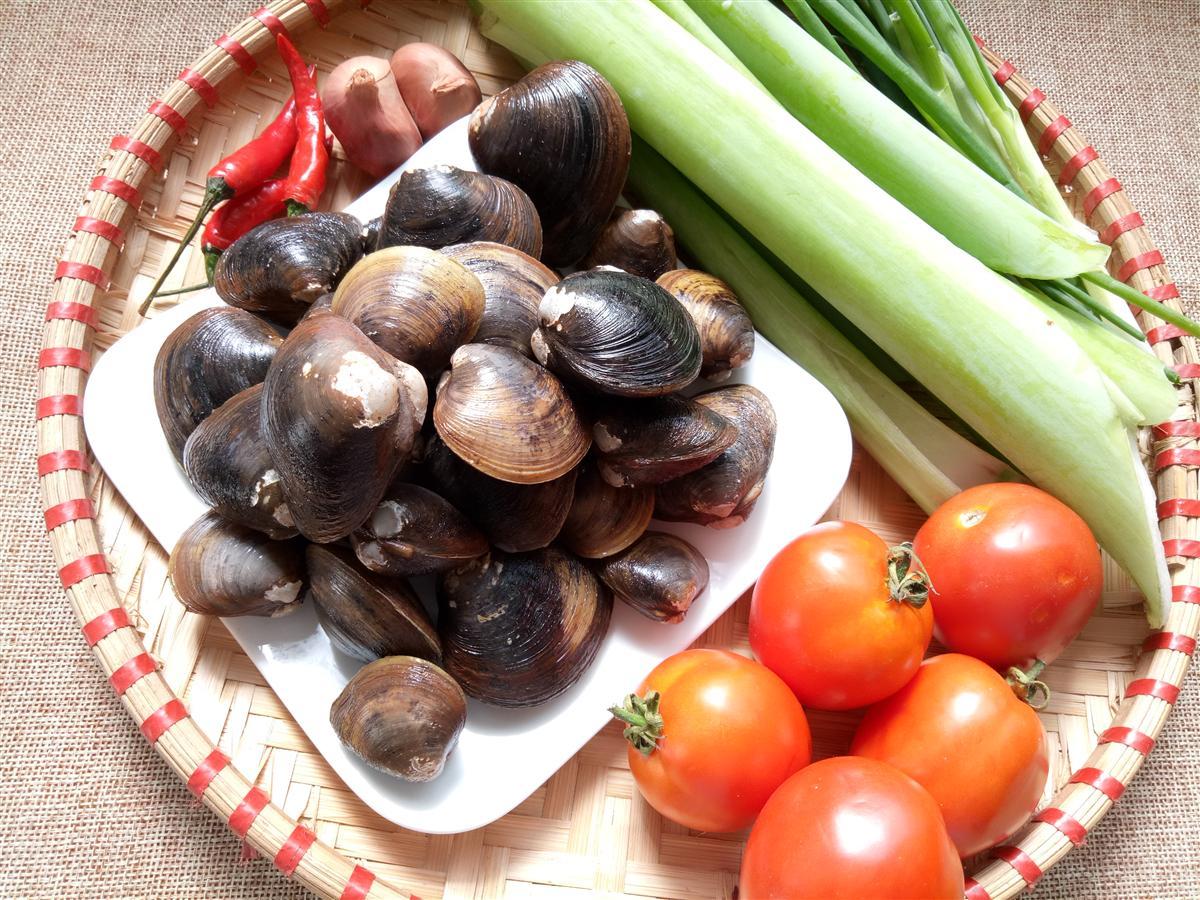 Phi thơm hành khô băm nhỏ với dầu ăn, cho cà chua vào xào cùng, nêm 1 thìa bột canh, đậy nắp vung để cà mau mềm. Sau đó cho thịt hến, sấu đã cạo vỏ vào xào cùng.