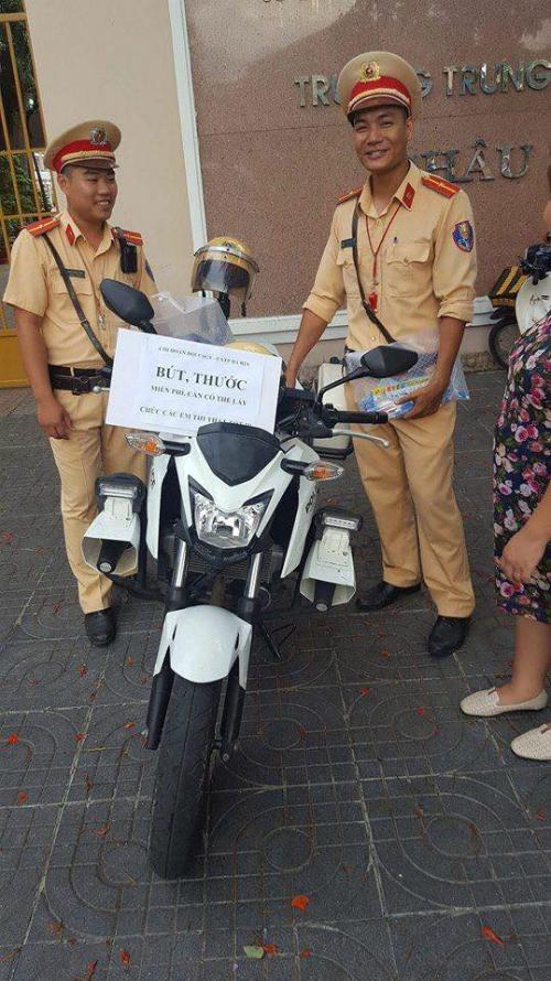 Chiều 25/6, mạng xã hội lan truyền hình ảnh hai cảnh sát giao thông làm nhiệm vụ đảm bảo an ninh trật tự, giao thông tại điểm thi Trường THPT Châu Thành, TP Bà Rịa (tỉnh Bà Rịa - Vũng Tàu). Kèm theo đó là tấm biển ghi dòng chữ tặng bút, tẩy chì, thước miễn phí cho các thí sinh đặt trên xe chuyên dụng, cùng lời chúc: "Chúc các em thi thật tốt".