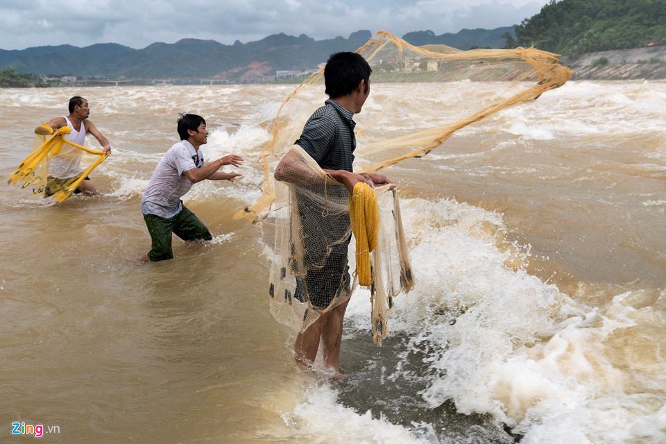 Thanh niên, trung niên gần đó thậm chí còn mang lưới ra đánh cá ở khu vực mép sông Đà, cách khu vực cửa xả lũ chỉ hơn 100 m.