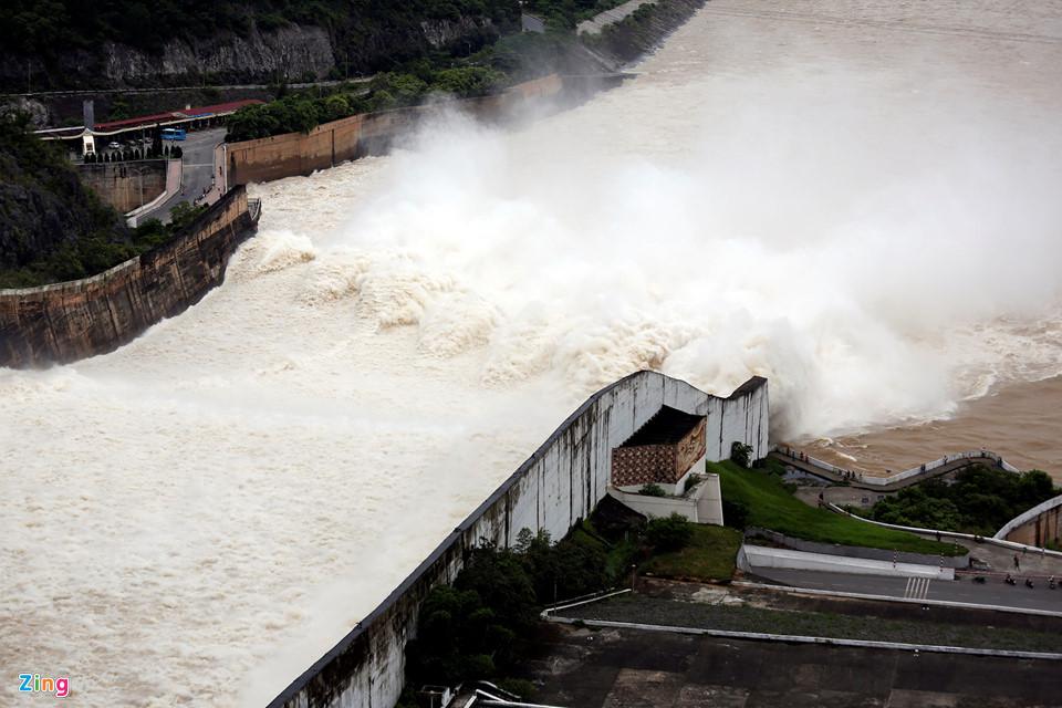 Hình ảnh xả lũ tại đập thủy điện Hòa Bình sáng 20/7. Do mưa lớn liên tục trong tháng 6 vừa qua và ảnh hưởng từ cơn bão số 2 khiến mực nước trên các hồ thủy điện miền Bắc ở mức cao. Lúc 10h ngày 18/7, mực nước ở hồ Hòa Bình ở cao trình 105,84 m, trong khi đó, lưu lượng nước đổ về hồ là 3.060 m3/s.
