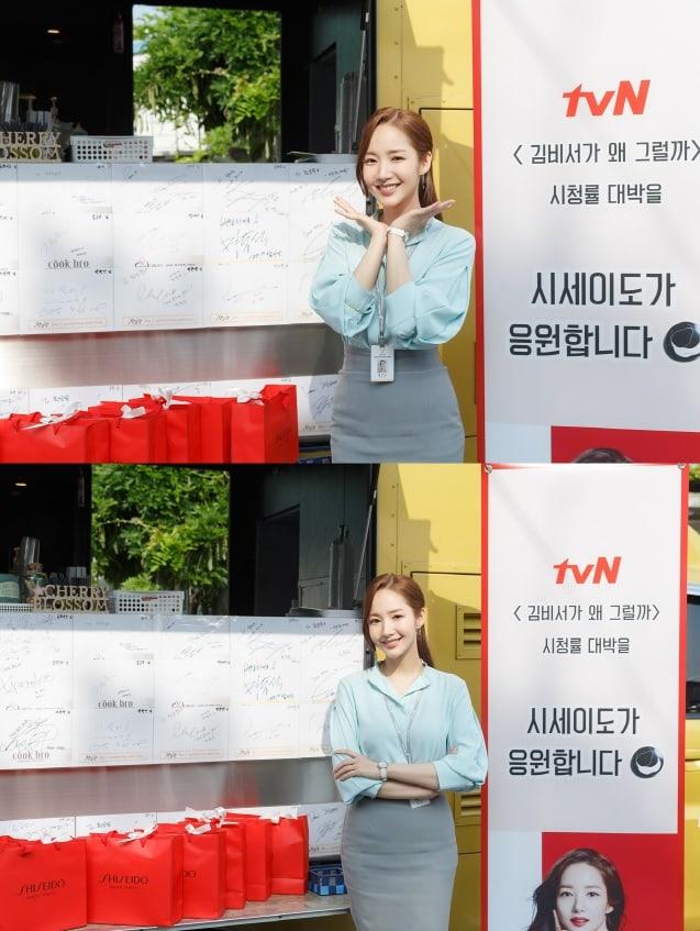Park Min Young đã gây bất ngờ cho đoàn làm phim “Why Secrectary Kim” khi chuẩn bị một chiếc xe tải cà phê với đồ uống, bánh ngọt đến phim trường để tiếp sức cho các nhân viên trong tiết trời nắng nóng