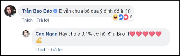 Nhưng vì quá mê và muốn được... "thị tẩm" đàn anh, Cao Ngân nằng nặc cầu xin: "Hãy cho em 0,1% cơ hội đi anh Bi ơi". Gắn kèm theo bình luận này là một loạt biểu tượng trái tim để thể hiện "tình yêu" nồng cháy.