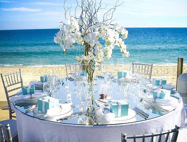 Các bàn tiệc được bày trí thanh lịch, theo tông màu trắng - xanh chủ đạo.