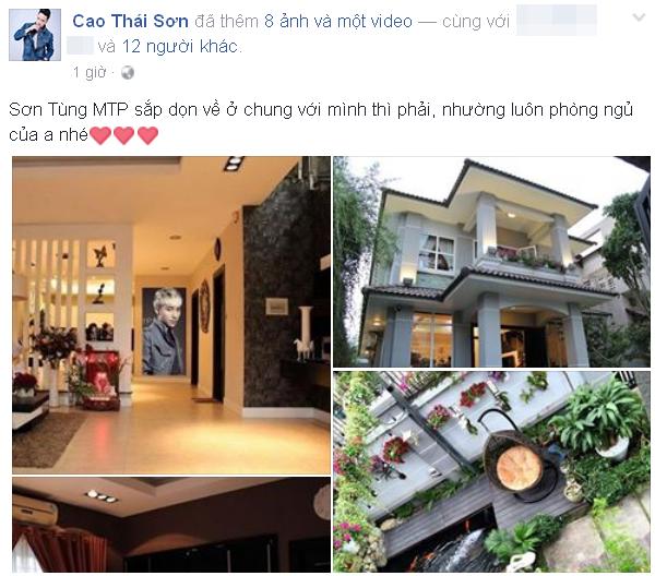 "Sơn Tùng M-TP sắp dọn về ở chung với mình thì phải, nhường luôn phòng ngủ của anh cho em nhé", nam ca sĩ họ Cao hóm hỉnh chia sẻ. Theo lời giọng ca Con đường mưa, hình ảnh của "sếp Sky" trong căn biệt thự chỉ là sản phẩm cắt ghép từ photoshop. Để chứng minh điều này, Cao Thái Sơn tung ra nhiều hình ảnh chụp bên trong trong căn hộ của anh để đối chứng.