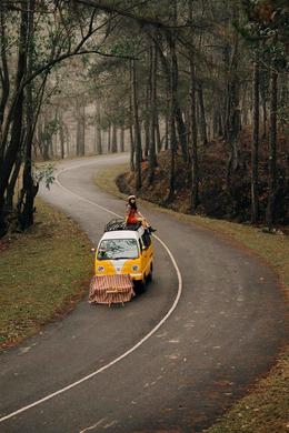 Bối cảnh chụp lần này là cung đường rợp bóng rừng cây cổ thụ phủ lớp sương mỏng nhẹ. Chỉ vài đạo cụ đơn giản như chiếc ô tô cổ điển màu vàng, bộ bàn ghế du lịch... bộ ảnh của hai cô gái giữ trọn vẻ dịu dàng, không kém phần bay bổng.