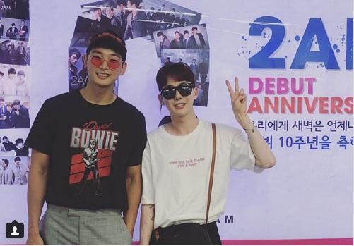 Hai thành viên Jinwoon và Jokwon của nhóm nhạc 2AM bên cạnh biển quảng cáo kỉ niệm 10 năm ra mắt. Jo Kwon đăng tải hình ảnh lên instagram với dòng chú thích: “Kỷ niệm 10 năm của chúng ta. Cảm ơn các bạn, tôi yêu các bạn IAM”