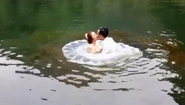Không trụ nổi, cô dâu đã phải bò lại lên thuyền trong khi chú rể vẫn cố thủ dưới nước khiến rất nhiều người xem cũng như toàn êkíp chụp ảnh tại đó phải cười ồ lên và trêu đùa rằng cô dâu nhất định không chịu... chết chung với chú rể.