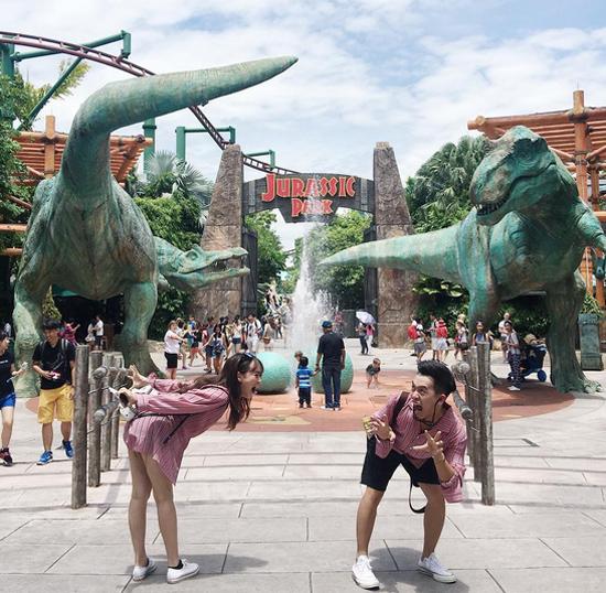 Nếu như chàng diện áo sơ mi xanh kết hợp quần shorts thì nàng cũng điệu đà