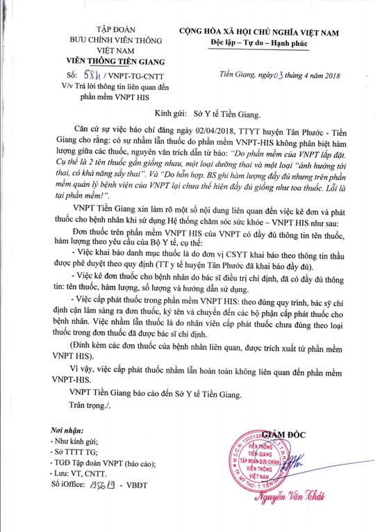 Ngày 4-4, trao đổi với phóng viên, ông Nguyễn Văn Thái, Giám đốc VNPT Tiền Giang, cho biết đã có văn bản báo cáo tập đoàn viễn thông với nội dung khẳng định vụ cấp nhầm thuốc phá thai cho 3 thai phụ ở huyện Tân Phước (tỉnh Tiền Giang) là hoàn toàn không liên quan gì đến phần mềm của VNPT như Giám đốc Trung tâm Y tế (TTYT) huyện Tân Phước phát ngôn với báo chí.