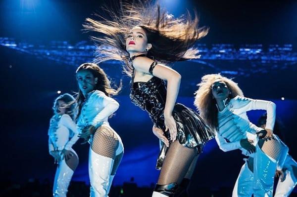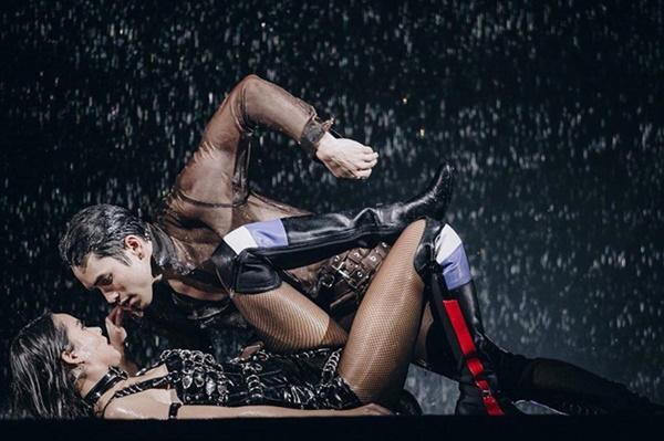 Dù nhiều lần kết hợp cùng nhau trước đây nhưng đây là màn trình diễn hiếm hoi cặp sao của đài CH3 táo bạo đến vậy. Bạn gái ngôi sao 28 tuổi xuất hiện gợi cảm trong trang phục ôm sát, quần tất lưới.