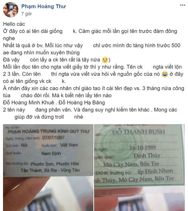 Bài chia sẻ của cô gái tên Thư về họ tên lạ của hai vợ chồng mới đây gây chú ý tại một diễn đàn của giới trẻ Việt. Ảnh chụp màn hình.