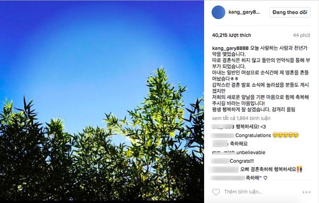Vào ngày 5/4, cựu thành viên "Running Man", nam rapper đình đám Gary đã khiến làng giải trí chấn động khi đột ngột đăng tải một bức ảnh kèm đoạn tâm thư dài tuyên bố anh đã kết hôn với bạn gái