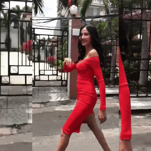 "Trong ngõ hẻm thôi mà cô gái cứ tưởng tượng sân khấu của Miss Universe nè", Hoàng Thùy chia sẻ về clip.
