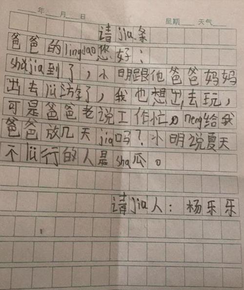 Một cậu bé 8 tuổi khiến người dùng mạng xã hội Trung Quốc xúc động với bức thư gửi sếp của bố. Trong bức thư viết bằng bút chì, bé trai cầu xin cho bố được nghỉ làm để gia đình cậu có thời gian đi nghỉ vài ngày cùng nhau, trước khi mùa hè kết thúc. Theo Red Star News, cha của cậu bé làm việc trong lĩnh vực công nghệ thông tin tại thành phố Bắc Kinh. Công việc quá áp lực khiến người cha không có thời gian rảnh đưa con đi du lịch.