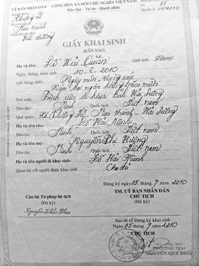 Phó Chủ tịch UBND xã, ông Nguyễn Văn Thành cho biết, chị Hương và anh Minh sống với nhau như vợ chồng ở xã thì nhiều người biết. Xã đã nhận được đơn tố cáo của chị Hương về việc cháu Quân bị anh Minh bắt giữ. Tuy nhiên, anh Minh có giấy khai sinh của cháu, ở đó ghi anh Minh là cha đẻ nên xã cũng chưa biết giải quyết thế nào. Bản sao giấy khai sinh mà xã Thượng Vũ cấp cho cháu Quân ghi họ Đỗ - Đỗ Hải Quân. Giấy được làm ngày 5/9/2010. Như thế, đến nay, cháu Quân mang hai họ, có hai giấy khai sinh, được cấp bởi chính quyền hai xã khác nhau của tỉnh Hải Dương.