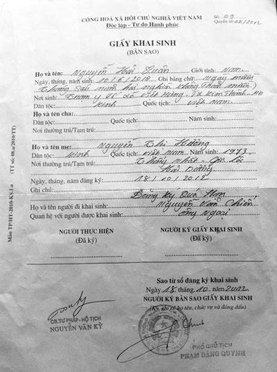 Bé Quân theo mẹ, về ở nhà ông bà ngoại và được chị Hương đi làm giấy khai sinh, rồi nhập hộ khẩu tại xã Thống Nhất, Gia Lộc, Hải Dương. Cháu được khai sinh mang họ mẹ, theo đúng quy định của pháp luật là Nguyễn Hải Quân.