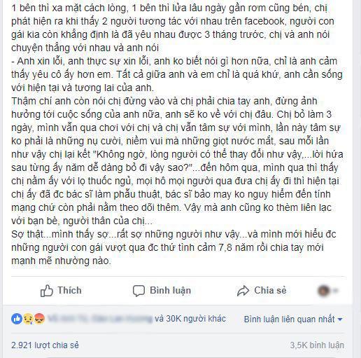 Để rồi, có lẽ trong lúc quẫn trí nhất, cô gái không thể chịu đựng nổi, đành tìm đến cái chết để quên đi nỗi đau. "Đến hôm qua, mình qua thì thấy chị nằm đấy với lọ thuốc ngủ, mình hô mọi người qua đưa chị ấy đi thì hiện tại chị ấy đã được bác sĩ làm phẫu thuật, bác sĩ bảo may không nguy hiểm đến tính mạng chứ còn phải nằm theo dõi thêm. Vậy mà anh cũng không thèm liên lạc với bạn bè, người thân của chị..."