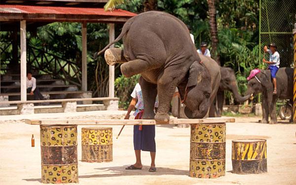 Sau khi được thuần hóa, voi sẽ bị bắt phải tập luyện diễn trò để thu hút du khách: từ việc cho cưỡi, tung hứng, đến quỳ lạy bên đường chúng cũng phải làm.