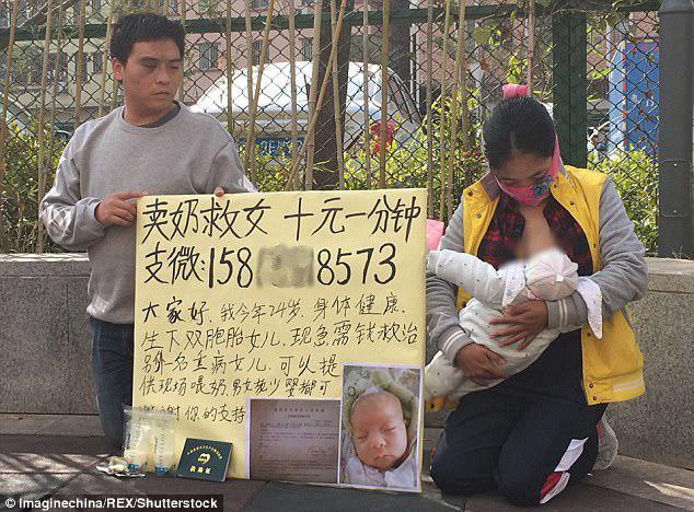 Theo tìm hiểu, bà mẹ trẻ họ Đường này mới 24 tuổi. Người đàn ông đó là chồng của cô. Hai vợ chồng chị Đường quỳ gối bên vệ đường cùng 1 tấm bảng hiệu viết những dòng chữ chia sẻ câu chuyện của họ. Trên tay chị Đường ôm một đứa trẻ sơ sinh. Bên cạnh đó là một túi sữa mẹ được đặt cho những người đi đường mua.