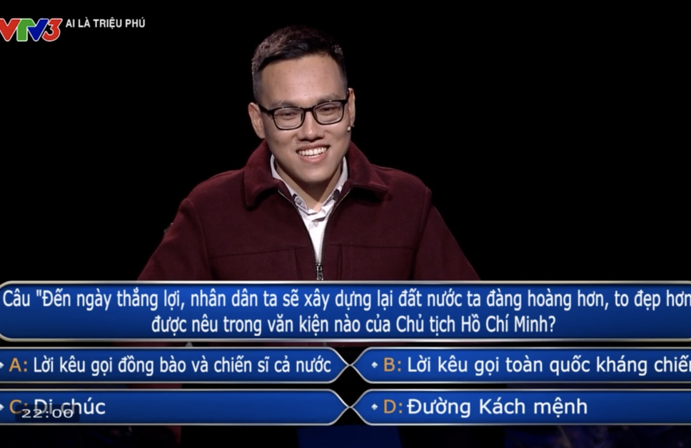 Giải thích: Ở ngưỡng cửa lịch sử để trở thành "Triệu phú" đầu tiên trả lời đúng cả 15 câu, anh Nguyễn Trường Giang đã gặp câu hỏi cuối cùng về một câu nói của Chủ tịch Hồ Chí Minh. Sau khi cân nhắc kỹ lưỡng và nhận thấy kiến thức chưa thực sự chắc chắn, anh đã quyết định không mạo hiểm để tránh bị tụt từ 150 triệu xuống mức 22 triệu đồng. Quyết định dừng chân đầy bản lĩnh này giúp anh trở thành người nhận mức tiền thưởng cao nhất trong số những kỷ lục gia từng chạm đến câu hỏi cuối cùng của chương trình tại Việt Nam.
