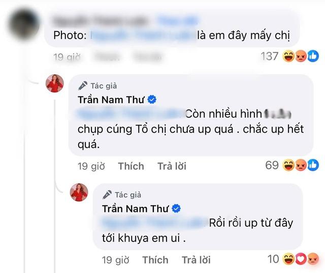 Mới đây, Nam Thư chia sẻ hàng loạt hình ảnh ở tại lần lộ diện gần nhất trên trang cá nhân. Cô còn gắn thẻ tài khoản của N.T.L - người được cho là nhiếp ảnh gia đồng hành với cô ở sự kiện giải trí vừa qua. Khi netizen dò hỏi về danh tính, Nam Thư còn lên tiếng cho biết đã làm việc với nhau từ lâu: "Chụp cho chị công khai mấy năm nay rồi em".