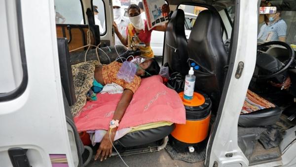 Một bệnh nhân nằm trong xe cứu thương chờ đợi để được vào bệnh viện (Ảnh: Reuters).
