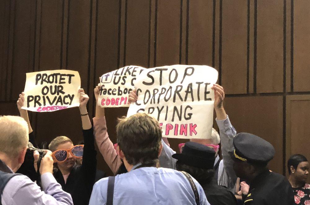Những người phản đối Facebook bên trong phiên điều trần Zuckerberg. Ảnh: Recode