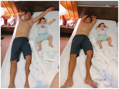 Nếu chưa kịp chuẩn bị "đạo cụ" là quần áo của cha mẹ, chỉ cần kéo cao cạp quần của bé lên và đút tay vào bên trong cũng đủ để có một tấm ảnh hài hước "theo trend" rồi. Ảnh: Nguyễn Trường Tuyết Mai.