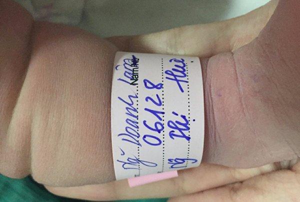 Tại BV Bạch Mai, trẻ được đeo dây nhựa mềm có bấm cố định có mã số, họ tên cả mẹ và con