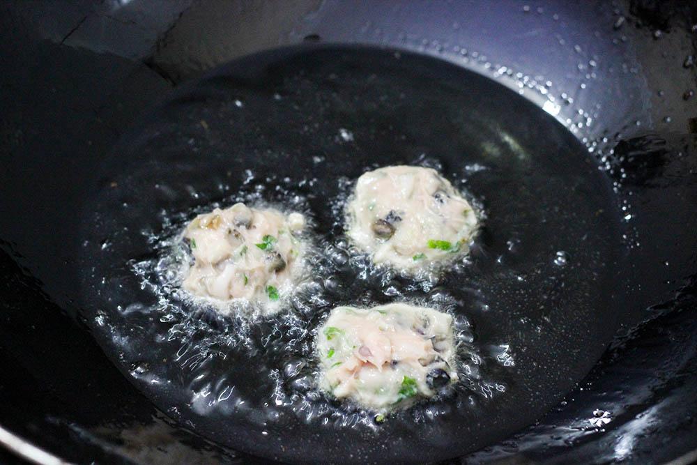 Đeo găng tay nilon, nặn chả ốc thành từng miếng tròn dẹt vừa ăn. Thả vào chảo dầu sôi chiên vàng đều hai mặt. Vớt ra đặt lên giấy thấm dầu. Ăn nóng.