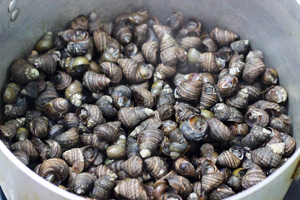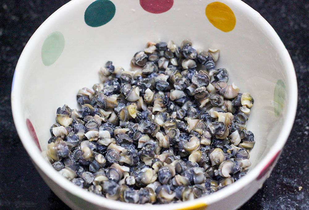 Đổ ốc ra rổ, khêu lấy phần miệng ốc (cồi ốc).