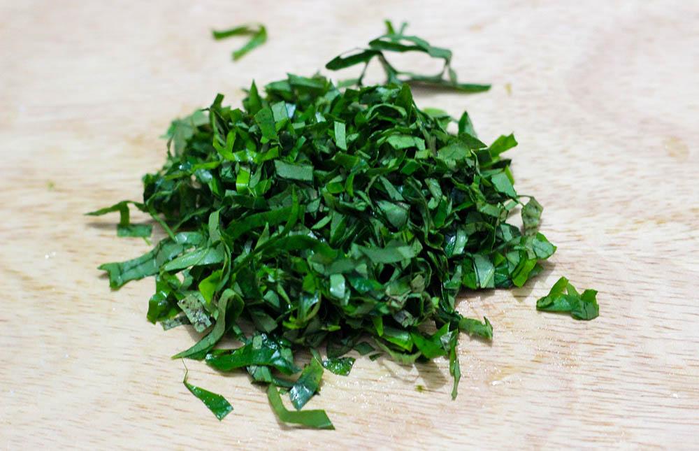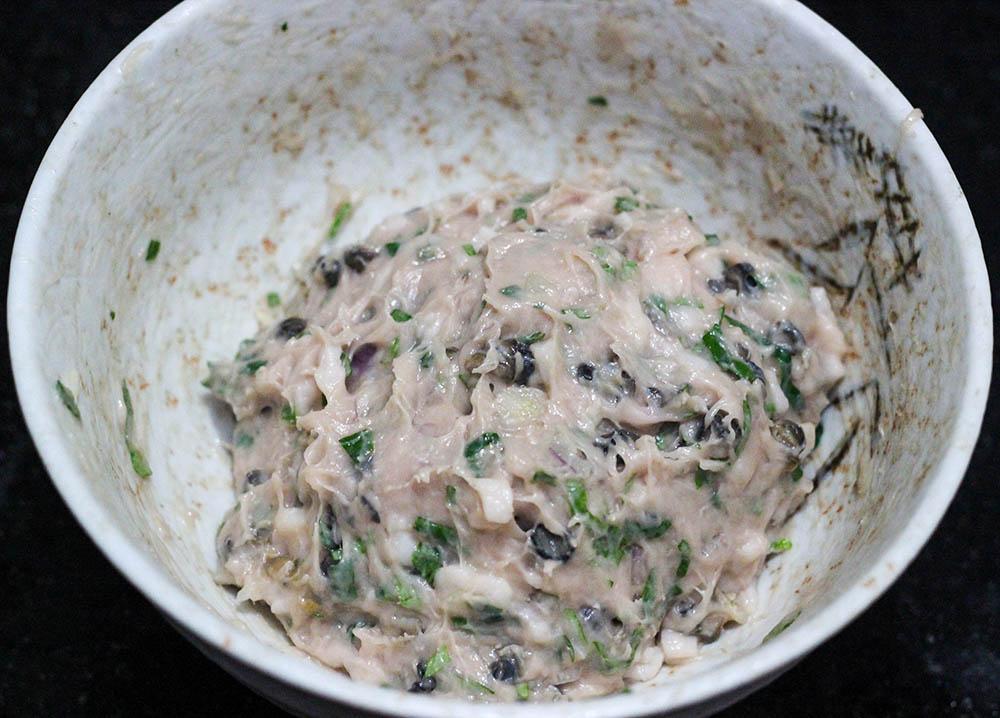 Trộn đều giò sống với ốc, hành khô, lá lốt, mỡ lợn và chút hạt nêm.