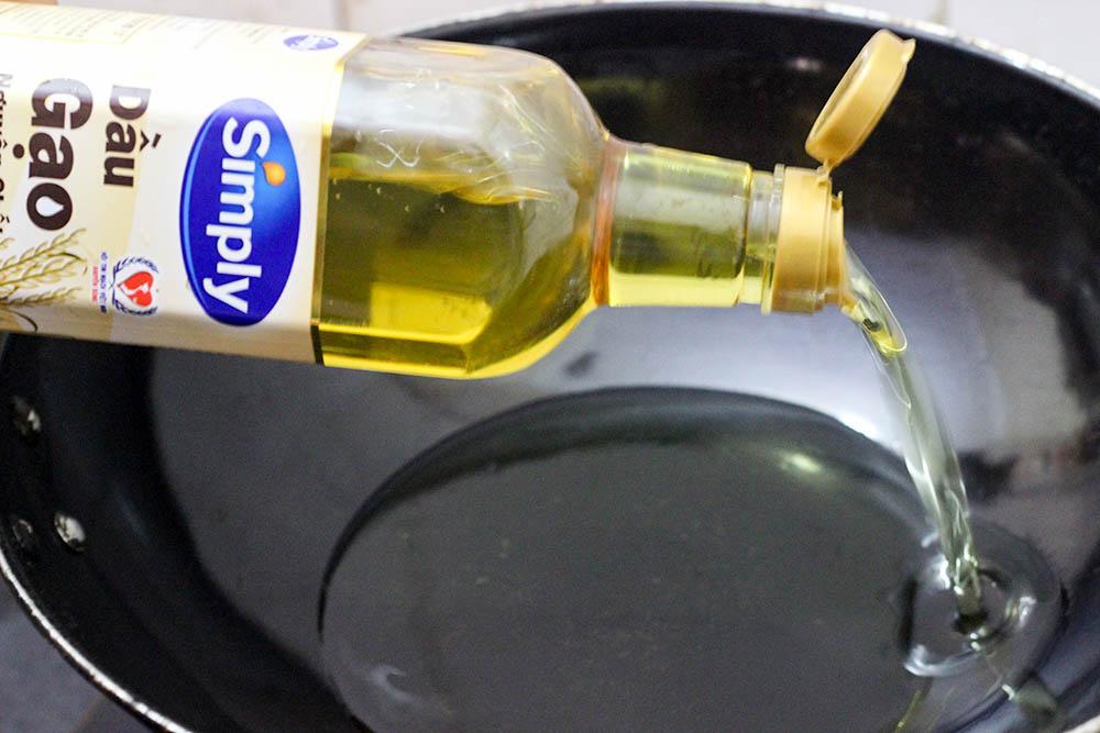 Đổ dầu gạo Simply vào chảo, đợi dầu sôi.