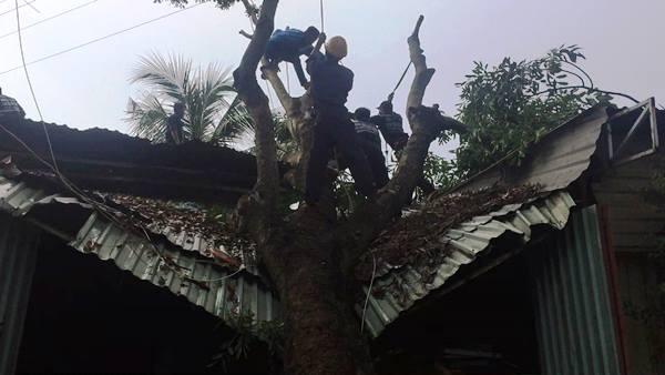 Lực lượng chức năng quận Thủ Đức có mặt để phong tỏa, đảm bảo an toàn. Nhiều công nhân của công ty cây xanh cũng được huy động để khắc phục sự cố.