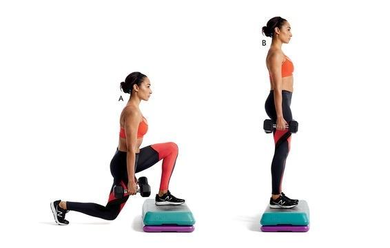 Đây là một trong những động tác giúp bạn sở hữu đôi chân thon gọn nhanh chóng. Bạn chỉ cần đứng thẳng trước bục cao 15 cm, mỗi tay cầm 1 tạ. Bước chân phải lên bục, hạ thân xuống sao cho chân trái đùi vuông góc với cẳng chân, gối không chạm sàn rồi trở lại tư thế đứng thẳng. Đổi bên và lặp lại 10 lần.
