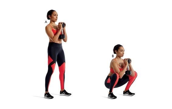 Rất đơn giản, bạn chỉ cần để chân rộng bằng vai, giữ một quả tạ thẳng đứng ở phía trước ngực, cẳng tay ép vào trong. Đẩy hông ra sau, uốn cong đầu gối để hạ cơ thể xuống sao cho đùi song song với mặt đất.
