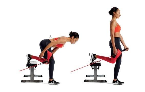Bạn hãy đứng phía trước máy kéo cáp tại phòng tập thể dục. Chống đỡ chân trái của bạn, uốn cong đầu gối trên một cái ghế dài phía sau bạn, kéo cáp giữ hai chân bằng bàn tay trái.