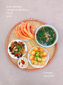 Mâm cơm nhà tối nay ai thấy cũng thèm gồm: Gà xào nấm hương, canh rau dền nấu thịt nạc, đậu phụ chiên tẩm mỡ hành và đu đủ chín.