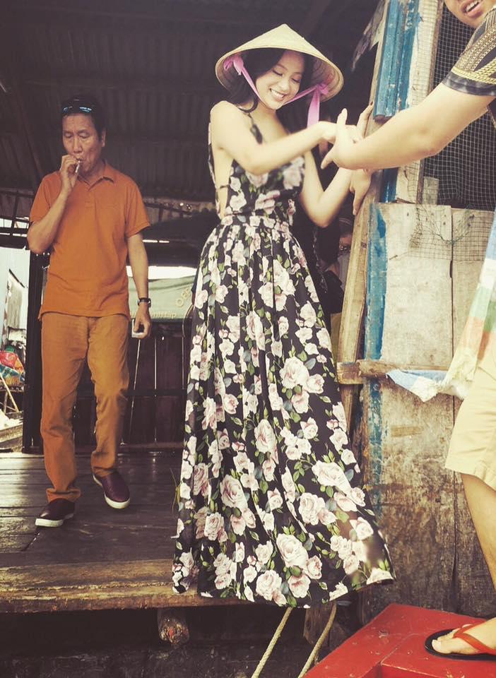 Diện váy yếm dáng dài chất liệu mềm mại, bay bổng mang đến cho cô nàng vẻ đẹp dịu dàng những cũng có chút bất tiện khi phải di chuyển nhiều trên sông nước.