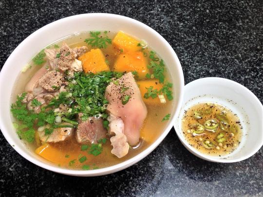 Chân giò hầm bí đỏ chấm cùng nước mắm trong cho thêm chút tiêu và vài lát ớt