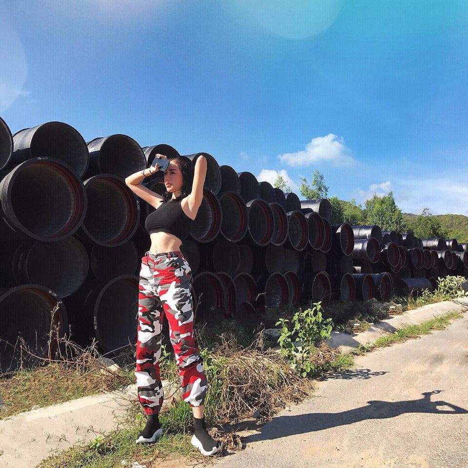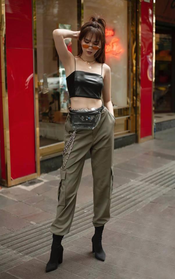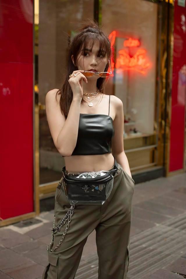 Trong bộ hình lookbook mới nhất, "nữ hoàng nội y" lăng-xê nhiệt tình mốt áo croptop mix quần túi hộp, dây xích. Chân dài nhấn nhá set đồ bằng loạt phụ kiện trendy như kính mắt nhỏ và túi belt bag trong suốt. Nhìn Ngọc Trinh trong style phủi bụi, các tín đồ thời trang không khỏi liên tưởng đến bóng dáng của "mẹ bỉm sữa" Elly Trần và nàng fashionista Quỳnh Anh Shyn.