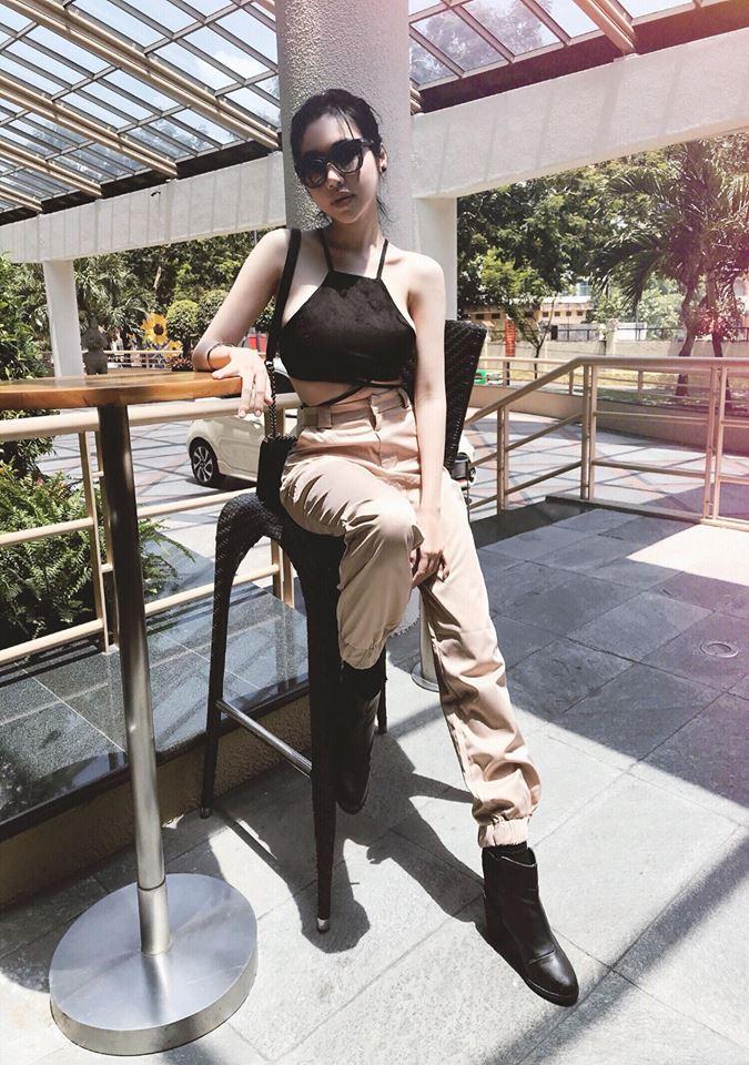 Áo yếm dáng croptop phối với quần rằn ri, giầy thể thao chẳng những mang vẻ khoẻ khoắn không kém phần sexy cho người đẹp.