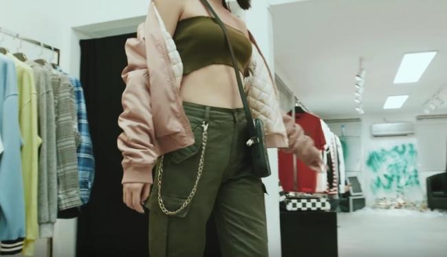 Cũng yêu thích chiếc quần túi hộp dây xích, cô nàng lại có cách kết hợp bắt mắt cùng áo 1 gang màu bộ đội ton-sur-ton, khoác bomber hững hờ.